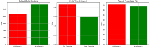 Simulation results demonstrated significant improvements with the expanded configuration: output increased by 31.8%, cycle times dropped by 10.3% on Line 1 and 50.6% on Line 2, and the rework rate decreased by 4.7%. These findings validated the effectiveness of the capacity expansion and highlighted the value of simulation modeling in supporting data-driven decision-making and continuous improvement, aligning with the principles of Digital Kaizen.